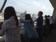 土浦駅前の教室の11階スカイテラスで、景色を見て、みんな驚きの表情。