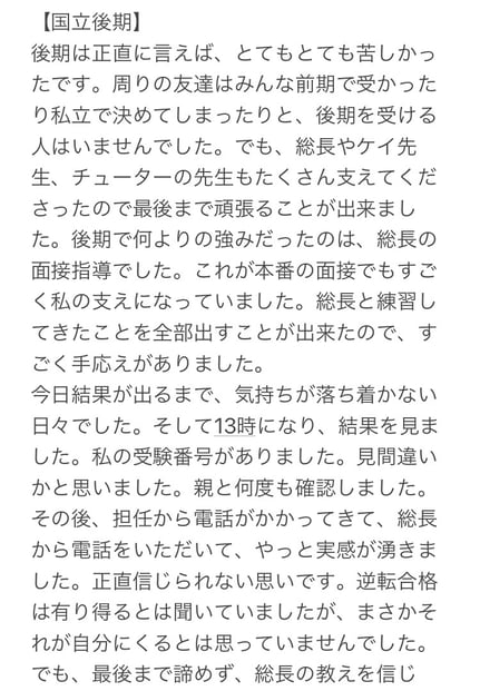 しかし、Aさんは違いました。前期がだめでもさらにキツくなる後期まで、最後までやるというのです。普通はもう成す術がないのですが、Aさんの後期試験は「面接のみで200点」という総長にとっては願ってもない形式なのです。そうなると、普通の面接では絶対に無理です。そこでAさんに仕組んだのは総長お得意の常識ではあり得ない面接指導でした。。