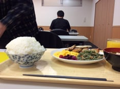 2日目の朝食。てんこ盛りは、ペヤングのトレー。ちなみにこのあと、おかわりで、サラダのてんこ盛りが見られた。底なし野郎だ。