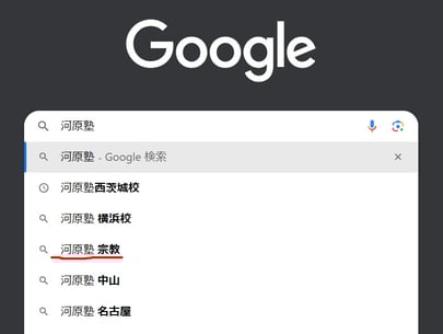 「河原塾」でネット検索をかけると、一部の方に画像のような検索候補が出るかと思われます。(赤下線部に注目)